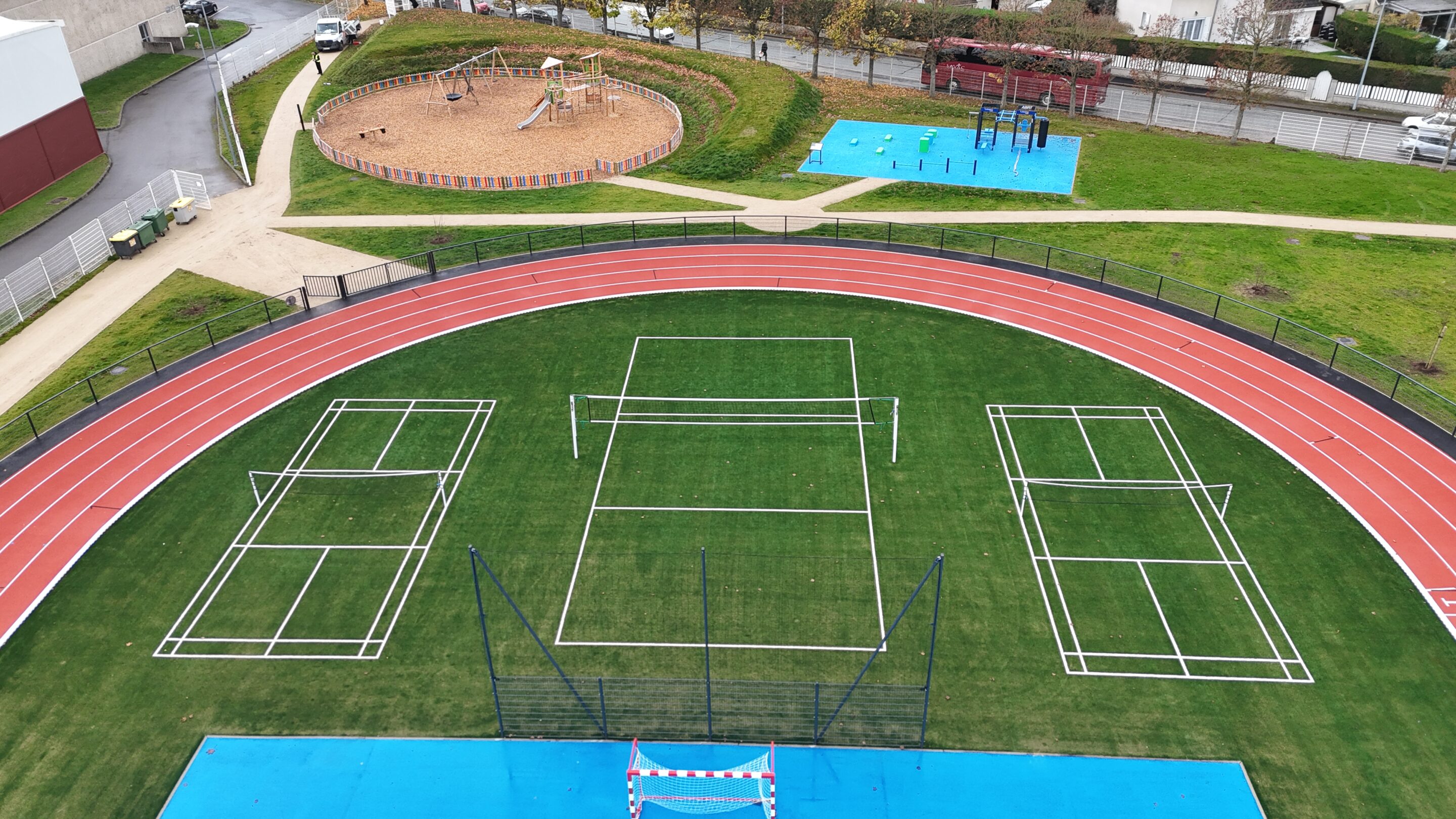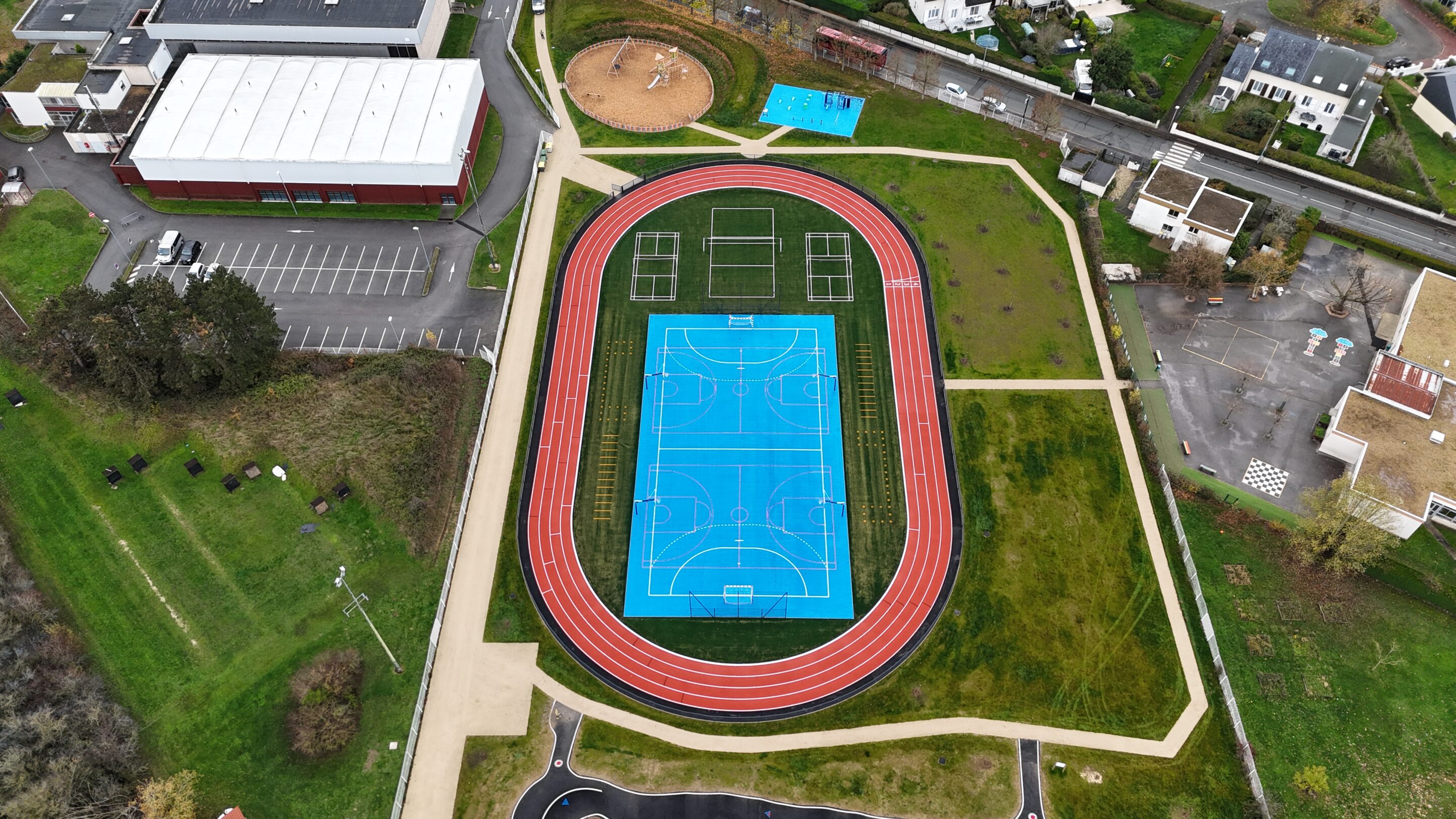 – La réalisation d’une piste d’athlétisme en résine synthétique de 4 couloirs,