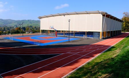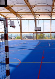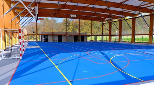 Conçue sur une structure bois–acier et couverte d’une membrane textile, cette halle prend la forme d’un vaste préau sportif abritant une surface en résine d’environ 1 200 m². Elle est équipée pour accueillir la pratique du basket-ball, du handball, du volley-ball, du badminton, du tennis, du futsal, ainsi que d’autres disciplines.
