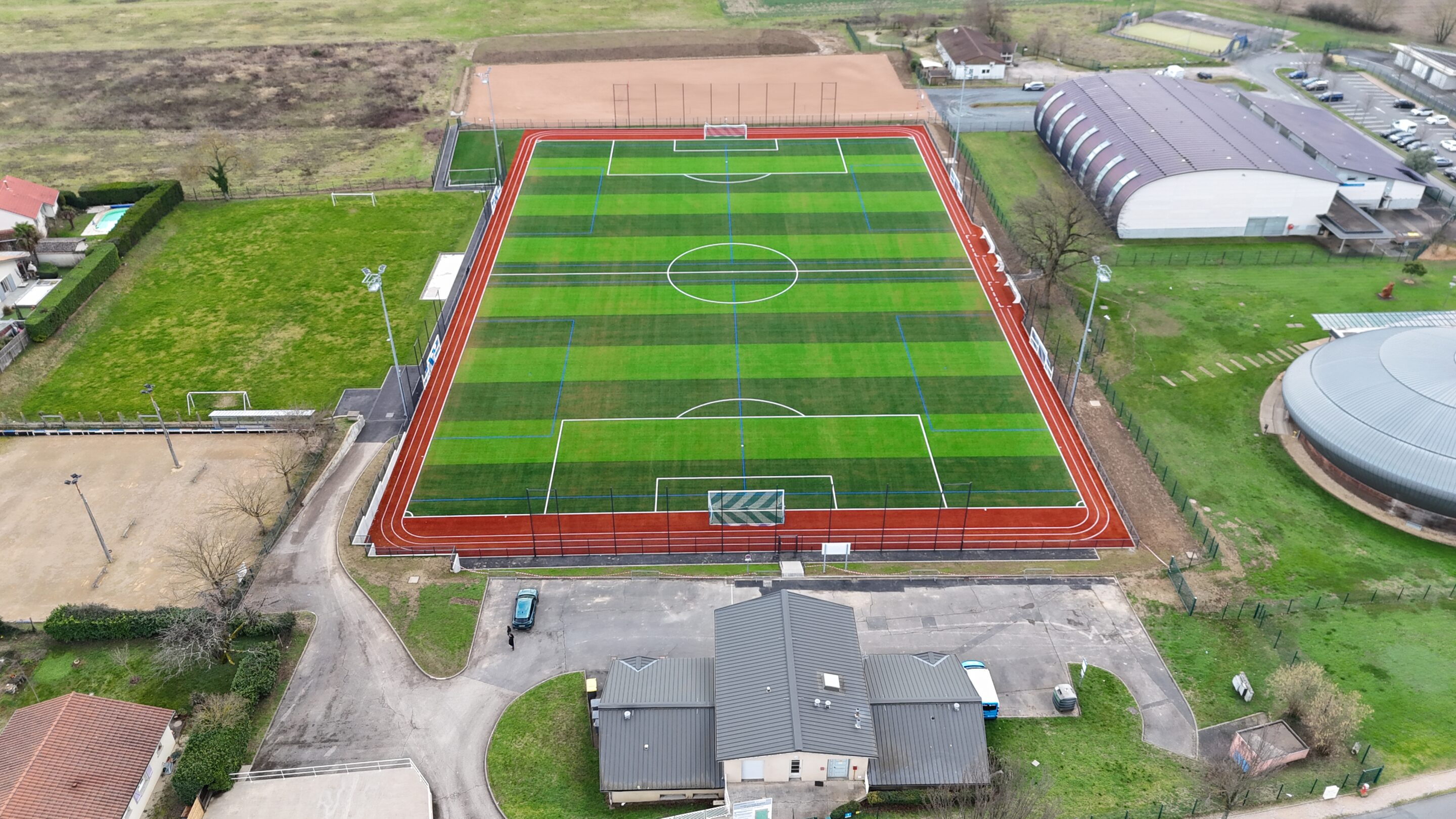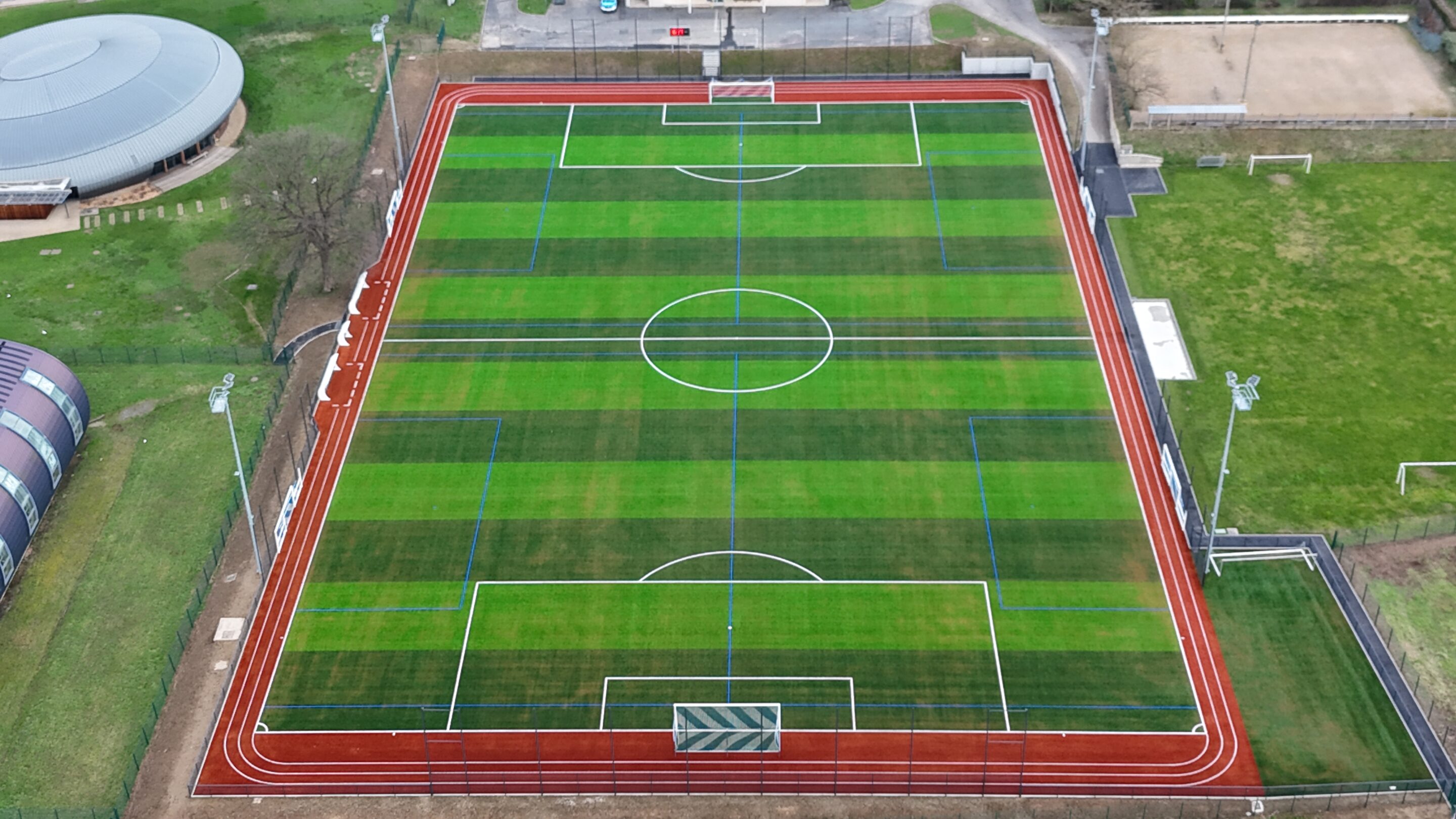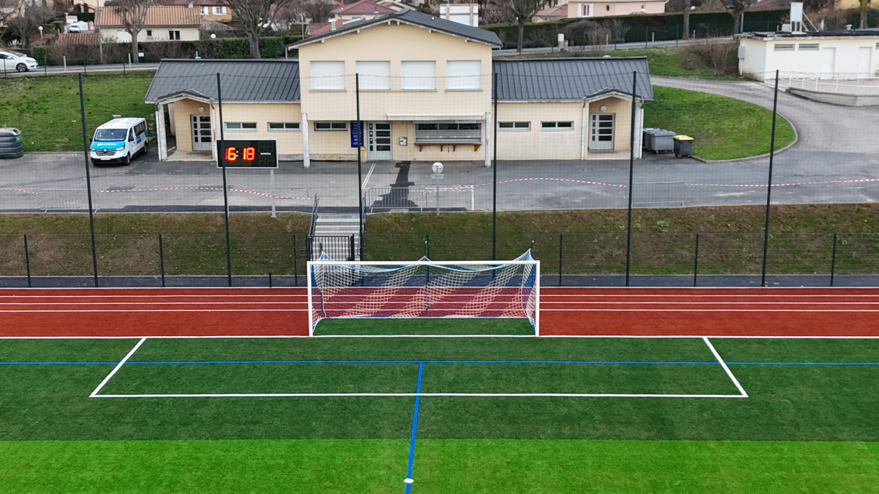 Ce projet comprenait également la création d’un effet piste d’athlétisme dans les dégagements du terrain ainsi que la création d’un éclairage sportif niveau E6.