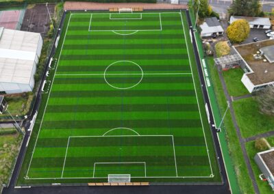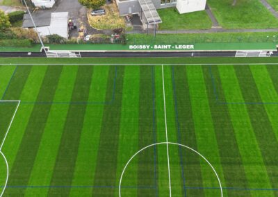 - La transformation d’un terrain stabilisé en terrain en gazon synthétique pour la pratique du football A11 et A8, la création d’une allée périphérique en enrobé et le traitement des espaces verts en périphérie du stade.