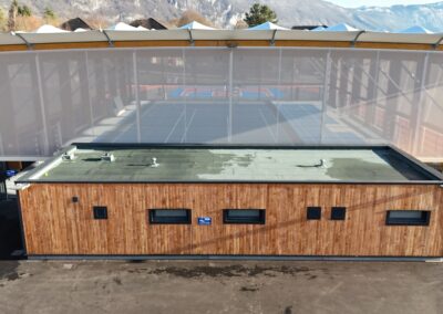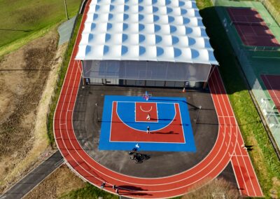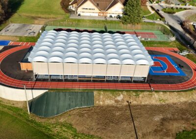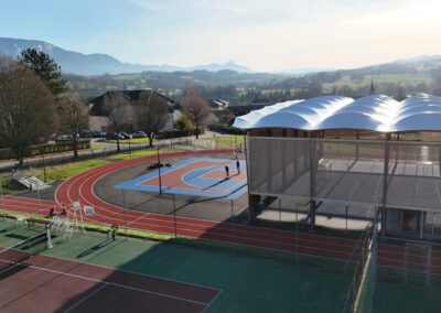 Conçue sur une structure bois–acier et couverte d’une membrane textile, cette halle prend la forme d’un vaste préau sportif abritant une surface en résine d’environ 1 200 m². Elle est équipée pour accueillir la pratique du basket-ball, du handball, du volley-ball, du badminton, du tennis, du futsal, ainsi que d’autres disciplines.